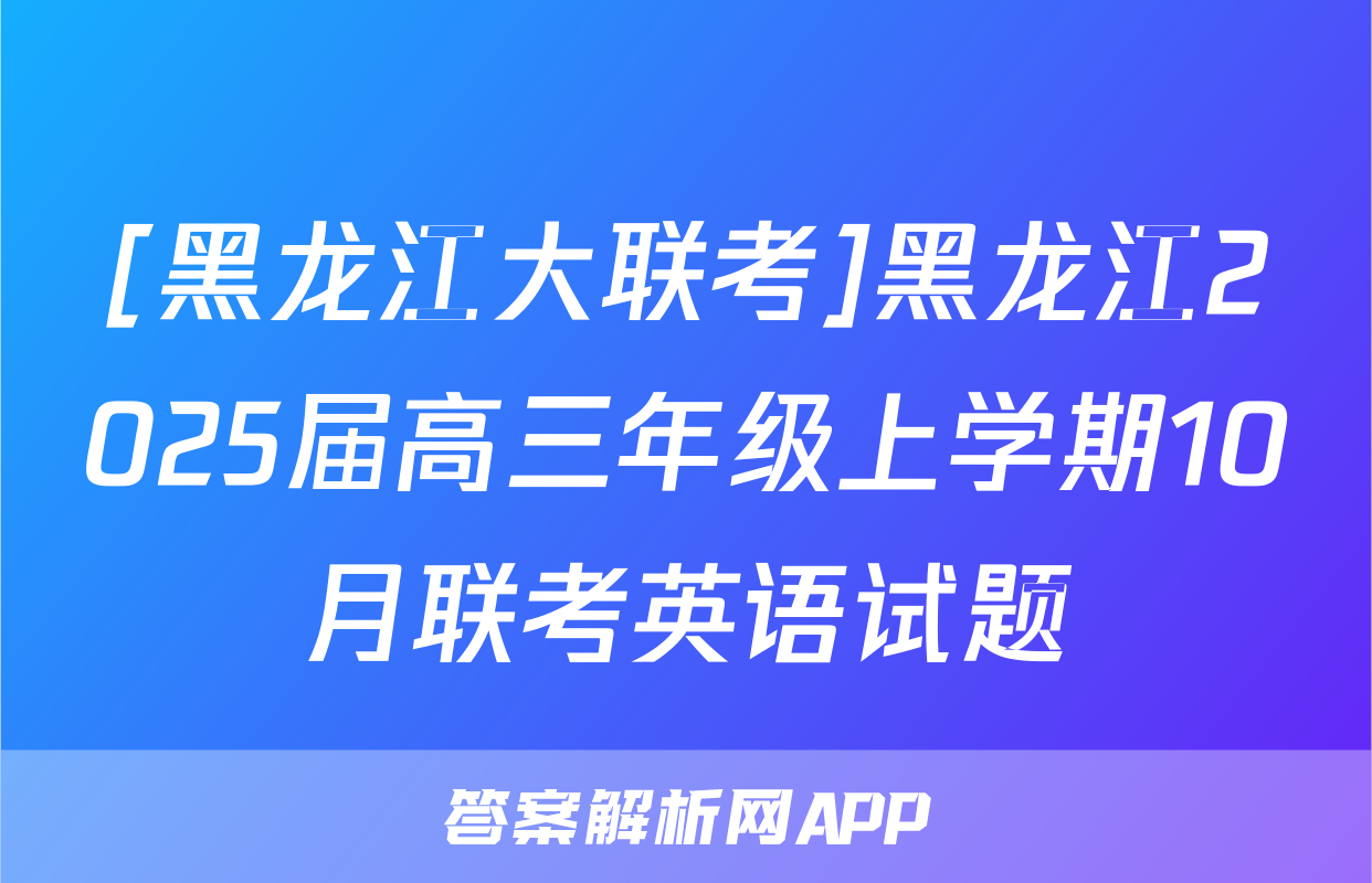 [黑龙江大联考]黑龙江2025届高三年级上学期10月联考英语试题,目前2024届百校联盟答案网已经汇总了[黑龙江大联考]黑龙江2025届高三年级上学期10月联考英语试题的各科答案和试卷,获取更多{{papers_name}}答案解析,请在关注本站。